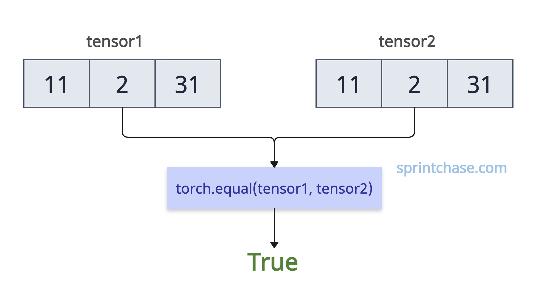 The torch.equal() method checks if two tensors are exactly equal in terms of shape and element values (even if their dtypes differ like int64 or float32). It returns True if the tensors are identical, and False otherwise.